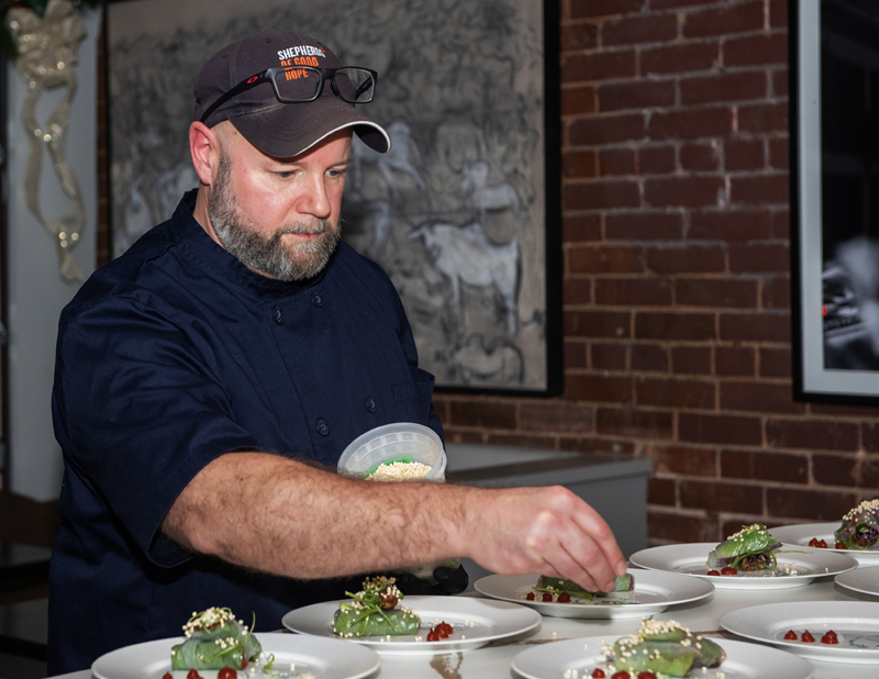 Chef Tim Barton (SOGH) plating appetizers at SOGH Foundation Grinch Dinner, Harmon’s Steakhouse, Nov. 27, 2025. Photo by Tia MacPherson for OBJ.